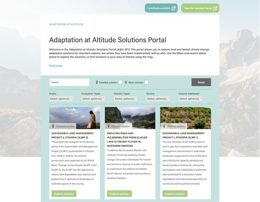 The Adaptation at Altitude Solutions Portal allows users to access and explore comprehensive knowledge on tried and tested climate change adaptation solutions for mountain regions, see where they have been implemented, and by who.
