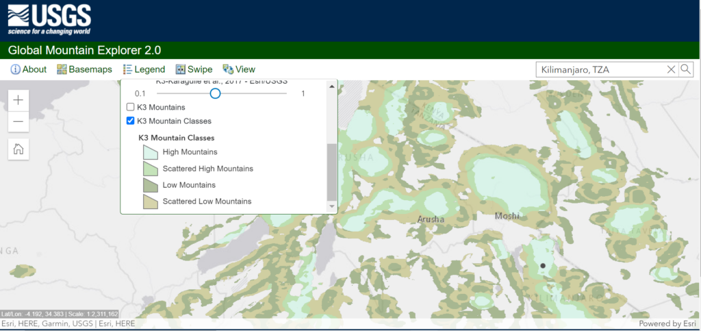 Despite the availability of well-developed and accessible documentation describing K1, K2, and K3, challenges remain in understanding how and where they differ. To facilitate access to and exploration of the three characterizations, the Global Mountain Explorer (GME) was developed. The GME is a map-centric web-based tool which allows users to query any location on Earth and identify whether or not it is mountainous according to these three characterizations. The map viewer has access to a wide range of functionality, including pan and zoom, making location queries split-screen pairwise comparisons, conducting text searches on place names, and displaying mountain areas over a variety of basemaps, including satellite imagery and topographic maps.