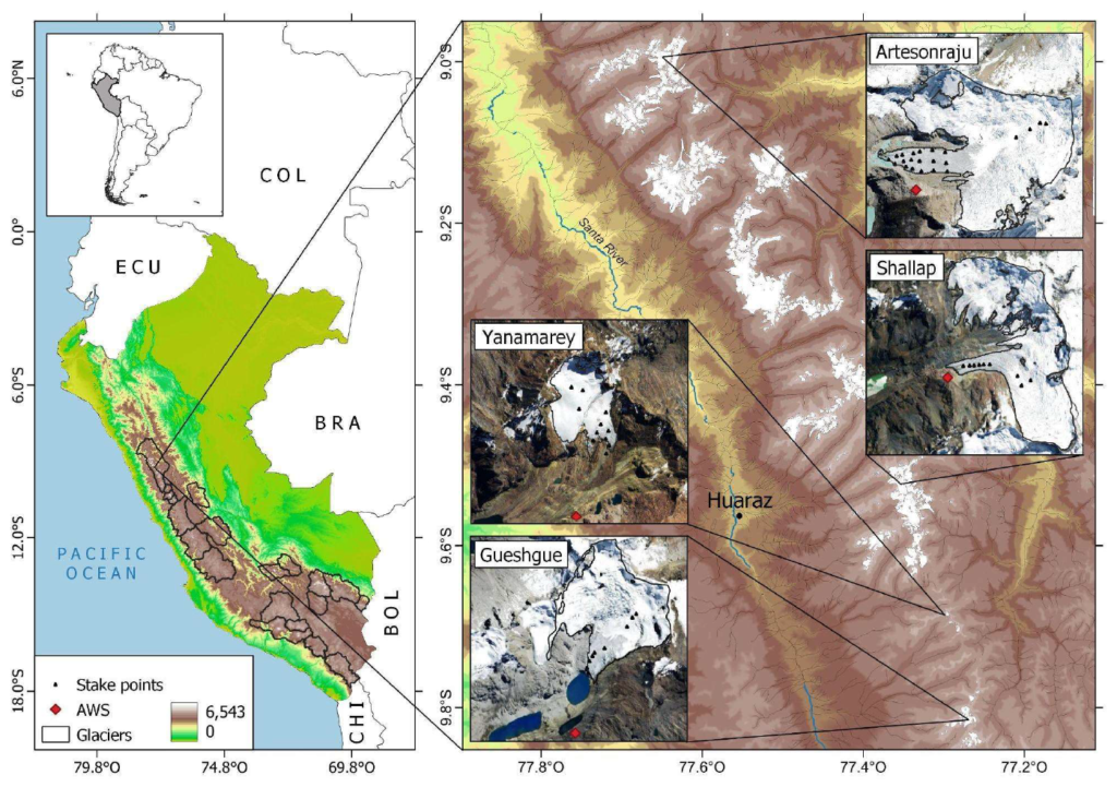 Fig. 1. Location map of the Artesonraju, Shallap, Yanamarey, and Gueshgue glaciers in the Cordillera Blanca. In the right panel, the stake network used for monitoring is shown as black dots, while the AWS located on the moraines of each glacier is represented by red dots. Source: Modified from Bello et al. (2025).